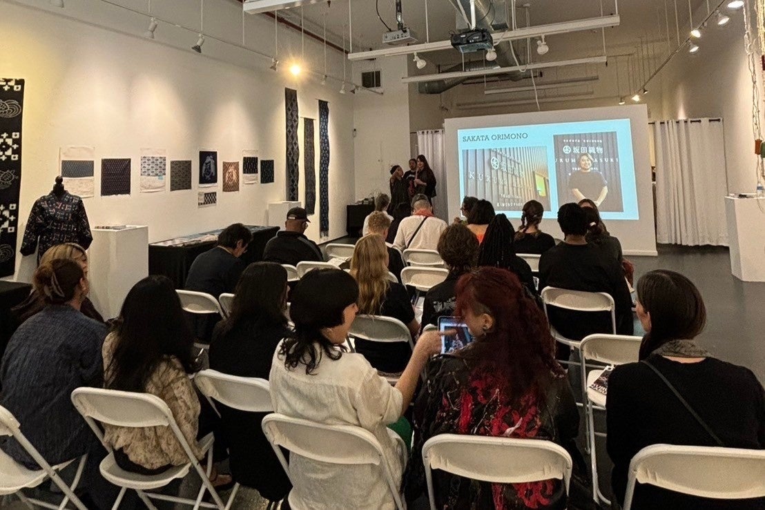 9月26日、ニューヨークにて開催されたテキスタイルの国際的な展示会「New York Textile Month※1」にて、国際ファッション専門職大学の学生が参加し、日本の伝統綿織物「久留米絣(くるめかすり)」の織元である坂田織物との展示発表※2を行いました。本学では、日本各地の繊維素材や染織技術の魅力を見出し、産地と連携しながら海外へ新しいファッション知財として発信することを目的としたカリキュラムに取り組んでおり、学生たちは久留米絣のパイオニアである坂田織物(福岡県八女郡)にて実習を行ってきました。