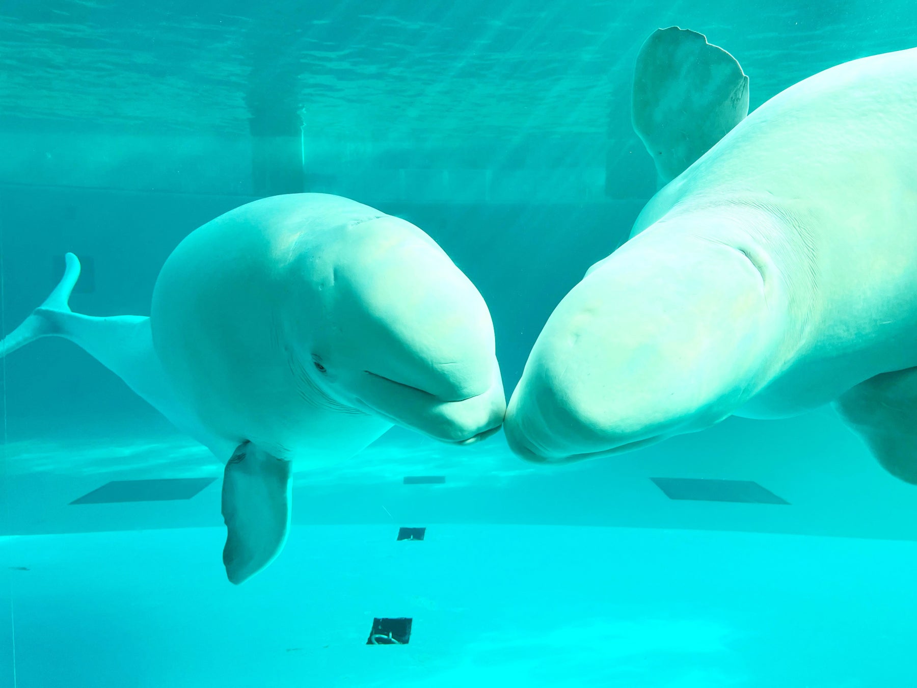 水族館「アクアミュージアム」1階LABO2「身近な海の生きもの研究所」では、シロイルカとトレーナーによる水中パフォーマンスを実施いたします。本パフォーマンスでは、自然の光がふりそそぎ時間によって表情が変わる空間で、シロイルカの生態や能力を活かし、シロイルカとトレーナーが一体感のある優雅な水中パフォーマンスを繰り広げます。 さらに、シロイルカ同士のキスなど愛らしい様子をご覧いただけます。