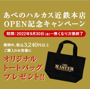 ザ・マスターbyバターバトラーあべのハルカス店のオープンを記念して、3,240円(税込)以上お買い上げのお客様へブランドオリジナルトートバッグをプレゼントいたします。