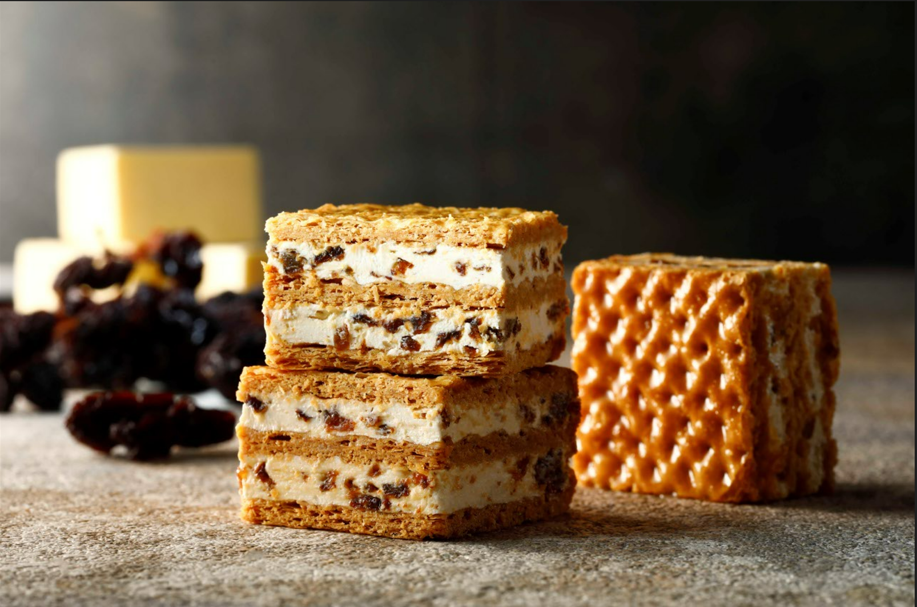 厳選した国産バターを使用した濃く深い味わいのバタークリームにラムレーズンを混ぜ込み、さっくり焼き上げた香ばしいパイと重ねてミルフィユに仕立てました。最高級ディロンラムが味と芳醇な香りを引き立てる、至高のラムレーズンバターミルフィユです。
