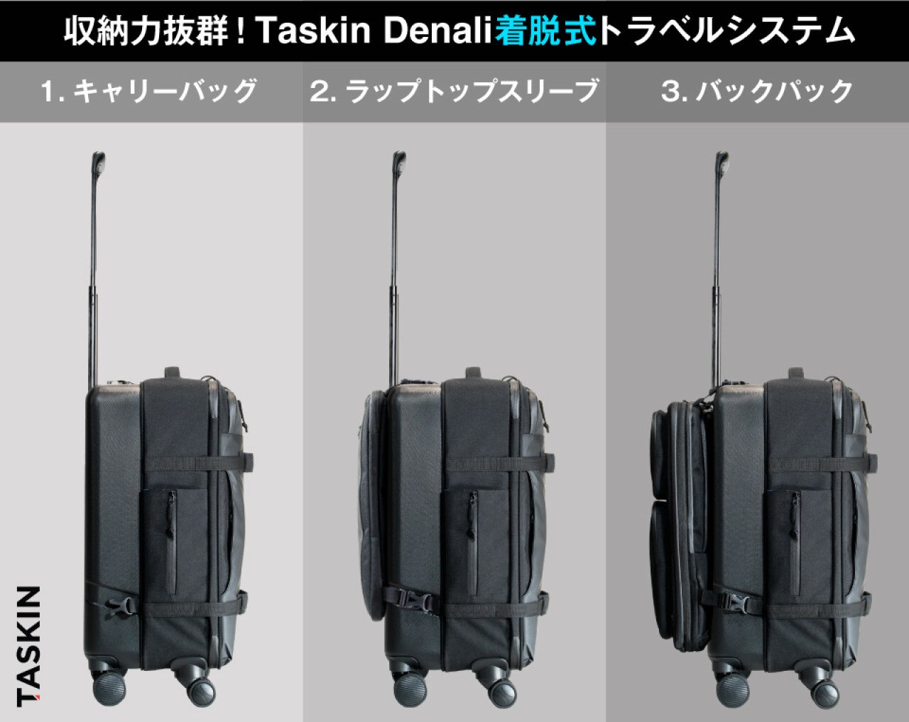「Taskin(タスキン)」は、旅をもっとスマートにする2つのトラベルアイテム。かさばりやすい洋服を真空圧縮するパッキングキューブ「TaskinAir MAX」と3つのバッグを自由自在に組み合わせられる「Taskin Denali」をご用意。