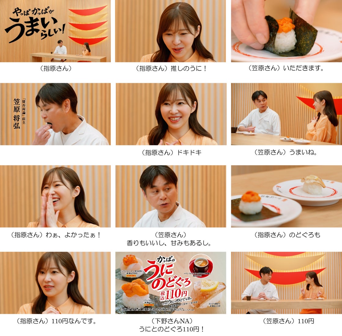 かっぱ寿司が開催する、数あるフェアの中でも人気商品の“うに包み”を笠原さんにご試食いただいております。笠原さんが“うに包み”を食べ、感想をいただくまでのドキドキした表情と、「うまいね。」という笠原さんの言葉に「わぁ、よかったぁ!」と喜ぶ指原さんの姿に、視聴する側も気になり笑顔になるCMとなっております。