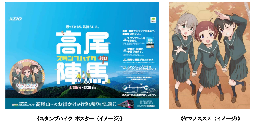 今回は、登山をテーマにしたアニメ 「ヤマノススメ Next Summit(ネクストサミット)」とのタイアップ企画で、作品には、高尾山と陣馬山が舞台の一つとして登場していることから聖地巡礼としてお楽しみいただけるほか、高尾山口駅改札内には、フォトスポットとしてスタンディパネルも設置します。
