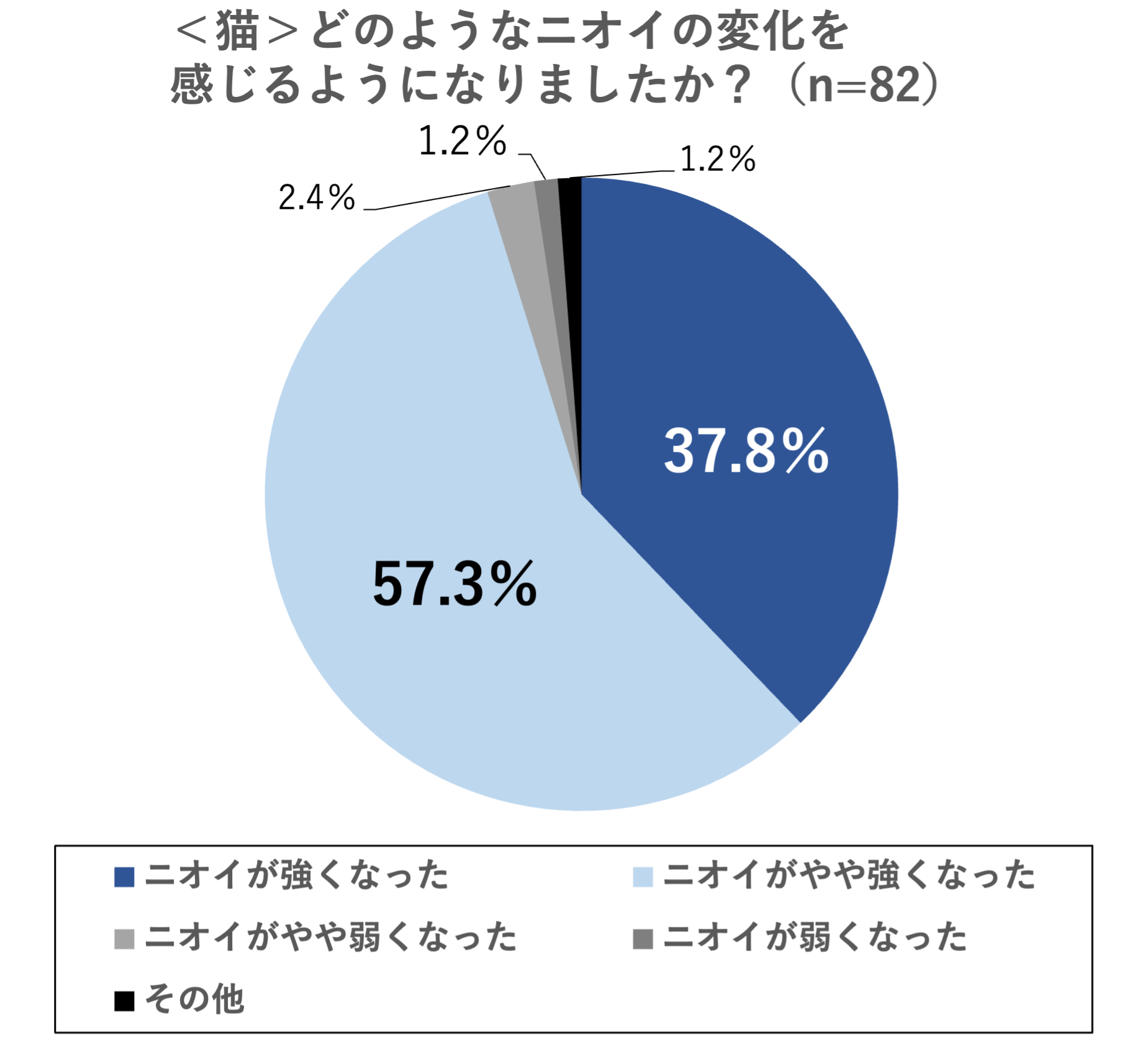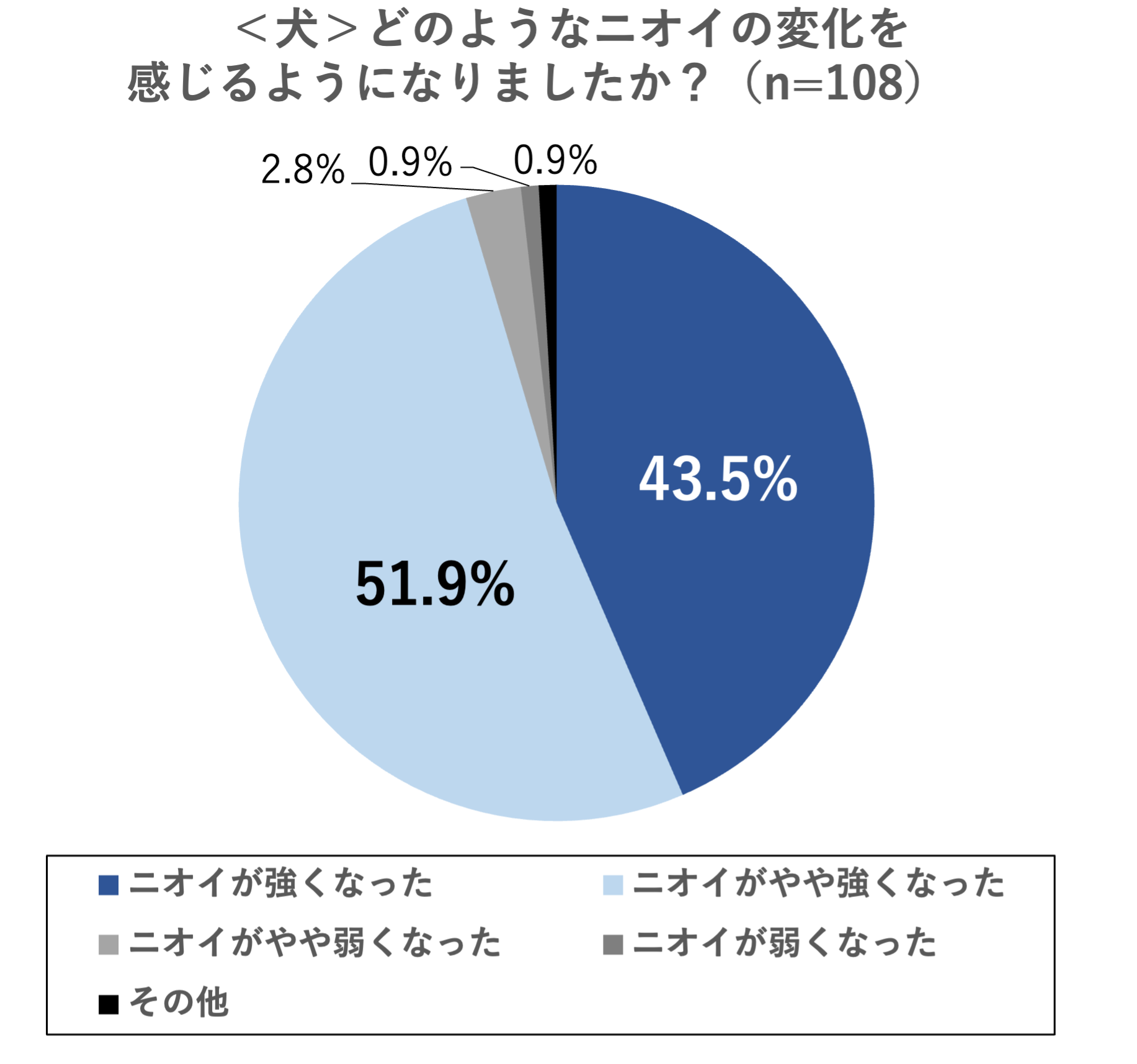 次に、高齢化したペットの気になることで上位にランクインした「ニオイ」(犬:25.3%、猫:19.4%)の悩みについても詳しく聞きました。具体的にどのようなニオイの変化を感じるようになったかについては、犬・猫ともに「ニオイが強くなった・やや強くなった」が9割を超える結果となり、ペットにおいても人間と同様、「加齢臭」のような身体的変化を感じるケースが多いことが明らかになりました。