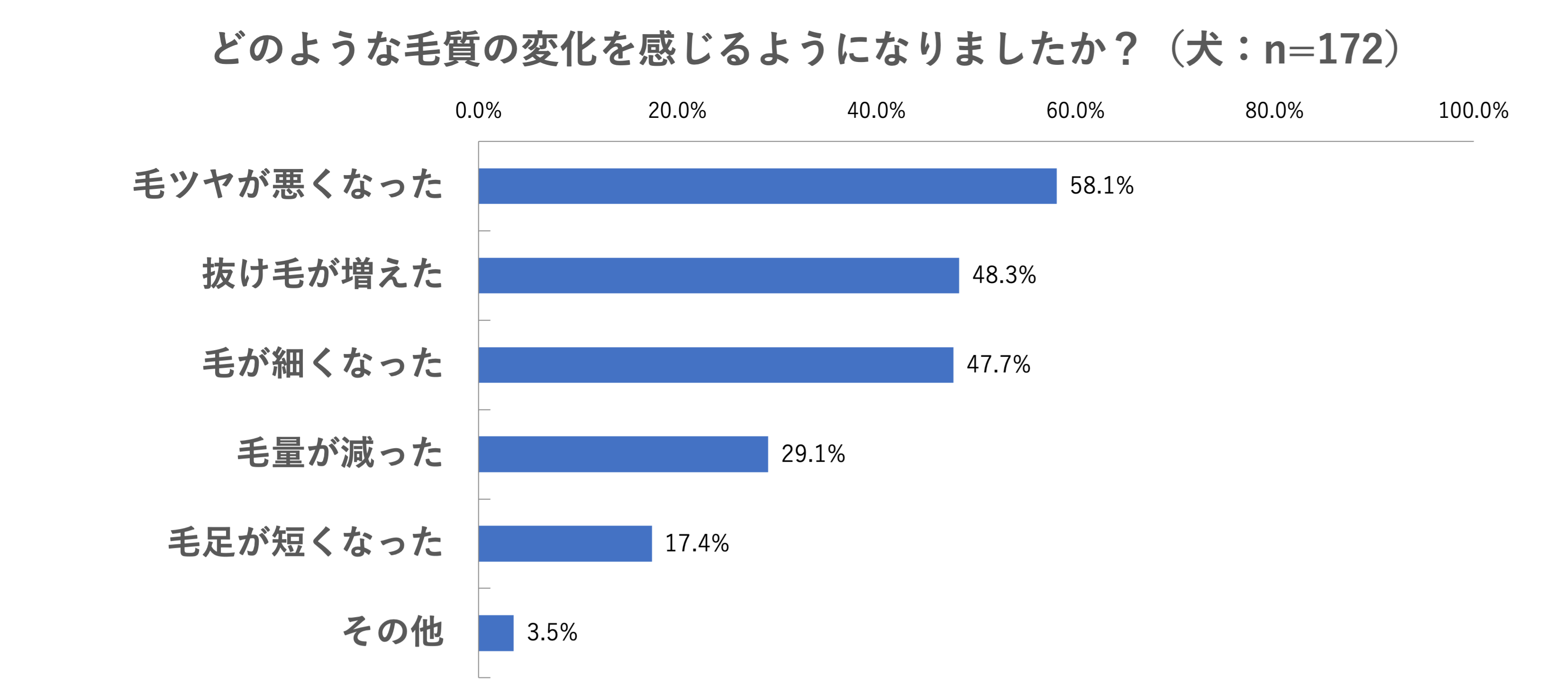 ペットの高齢化に伴い、気になるようになったことを聞くと、犬は1位が「毛質の変化(29.0%)」。一方、猫は「食事の嘔吐(36.6%)」が圧倒的に多く挙げられ、犬・猫では異なる悩みがあることがわかりました。また、犬の毛質の変化を具体的に尋ねたところ、「毛ツヤが悪くなった(58.1%)」、「抜け毛が増えた(48.3%)」と感じる方が半数近くにのぼりました。