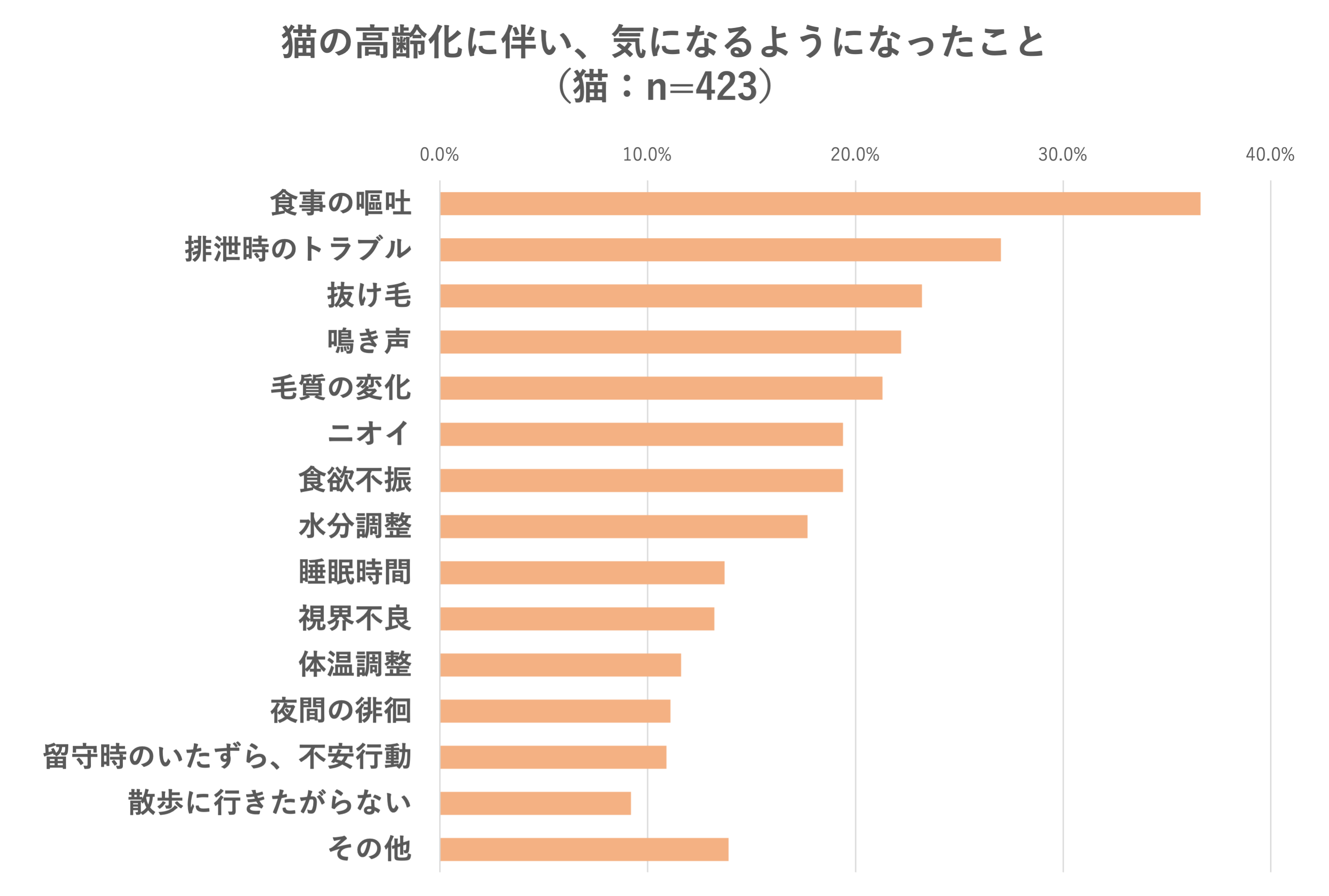 ●高齢化に伴い気になること1位は犬「毛質の変化」、猫「食事の嘔吐」。犬の場合は「毛ツヤの悪さ」や「抜け毛の多さ」が目立つ傾向に。