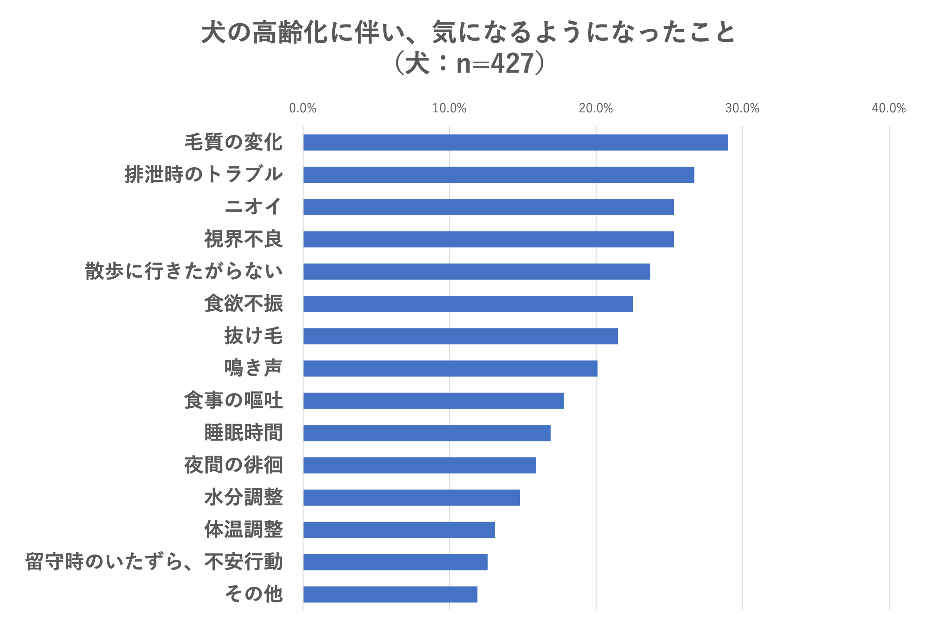 また、犬・猫に共通して上位に挙げられていた「排泄時のトラブル」について具体的な悩みを尋ねたところ、「所定の位置で排泄しなくなった」、「尿切れが悪く、トイレ以外でも撒き散らす」と回答。今まで習慣化していた行動が年齢とともに変化してくる傾向にあるようです。また尿切れが悪くなるといった、身体的な衰えも、飼い主を悩ませているようです。