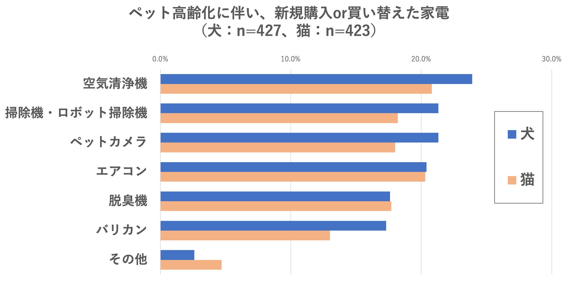 ペットが高齢化することに伴い購入したアイテム上位は「空気清浄機」「掃除機・ロボット掃除機」。