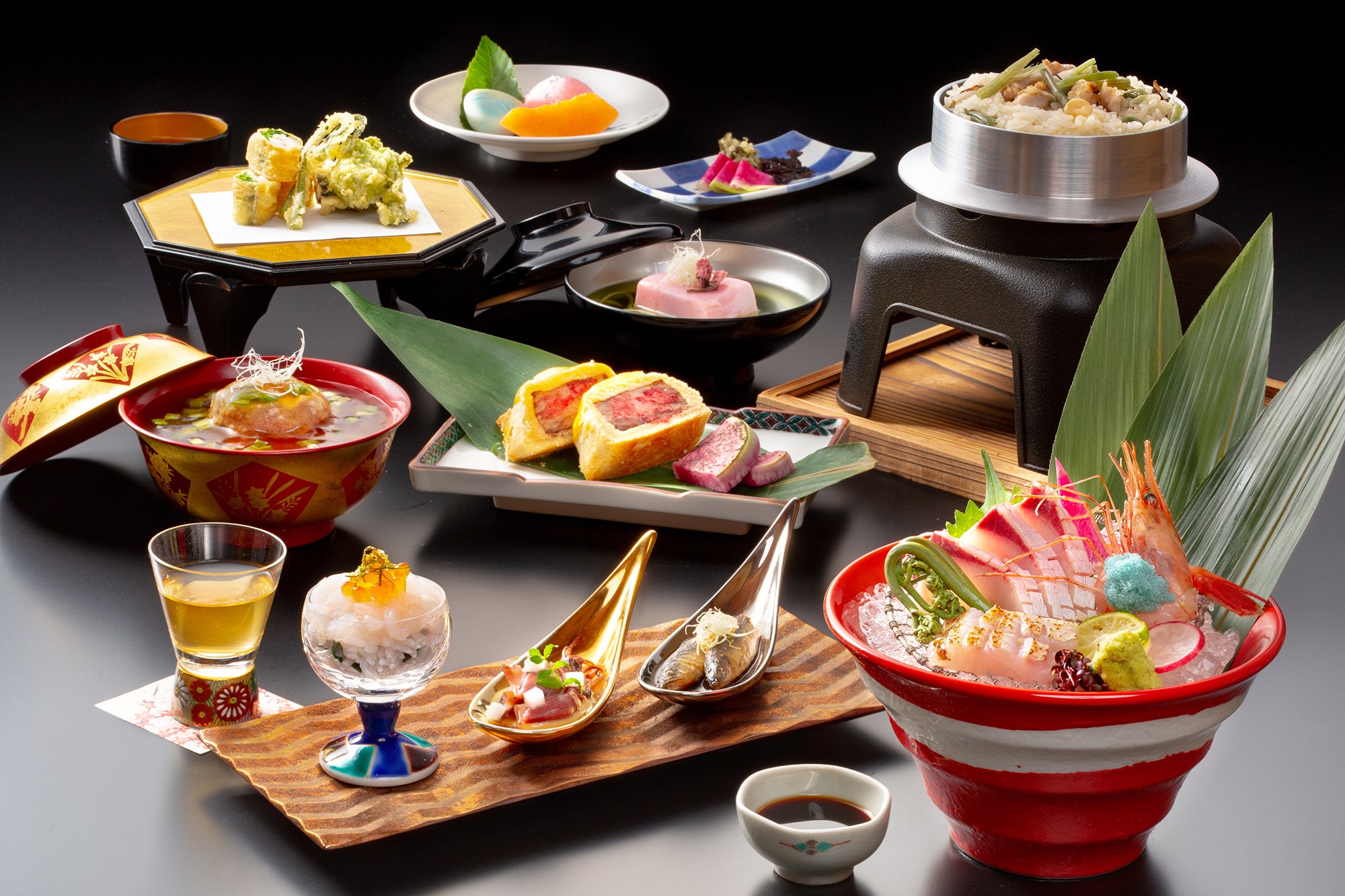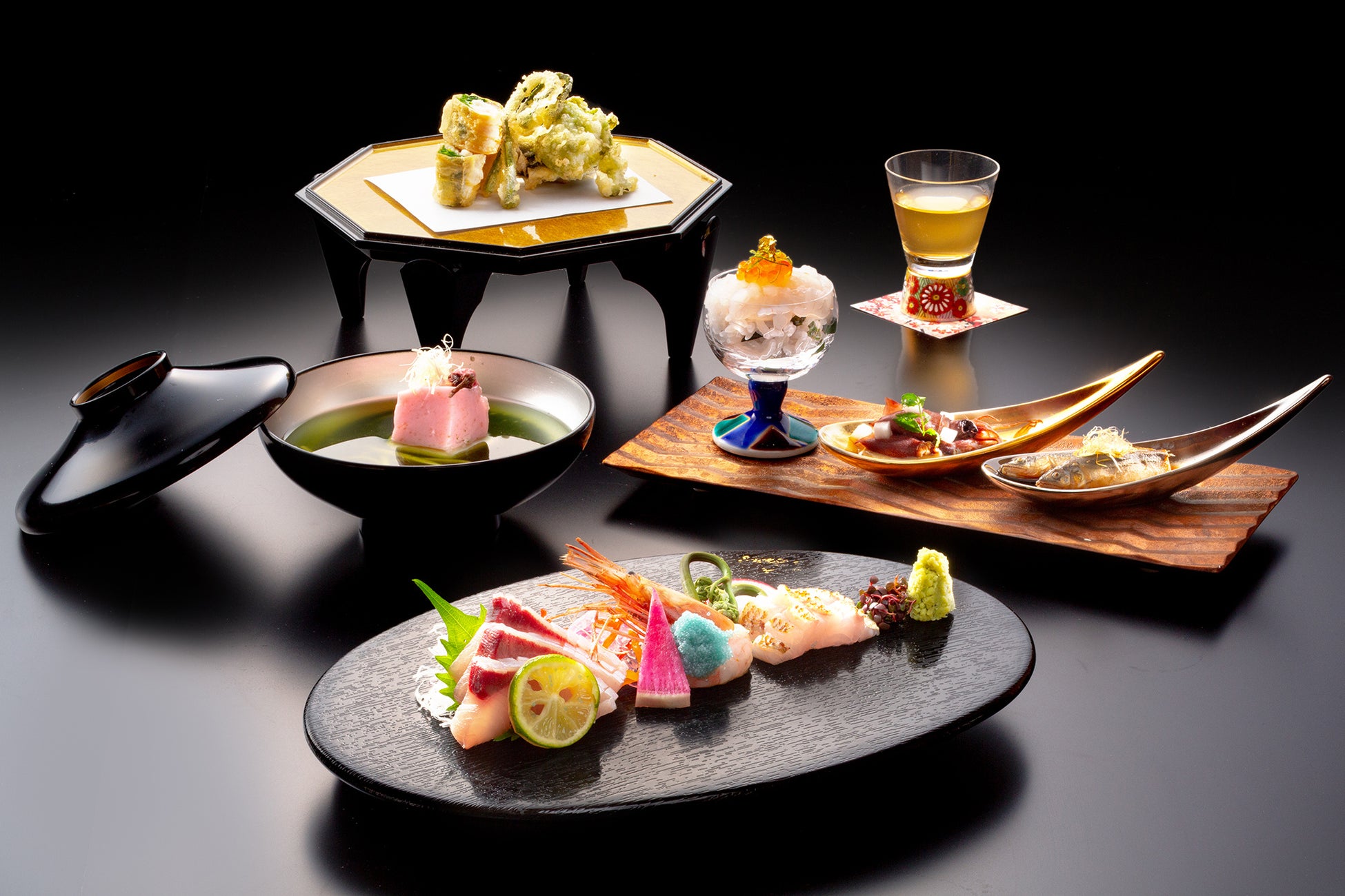 4月に漁が解禁される白海老やホタルイカ、夏は鮑や鱧、毛蟹、合鴨、能登牛、加賀野菜などを味わえる会席料理は、「宿の夕食が少し重い」「残すのがもったいない」「食事量を控えてお酒を」というお客さまの声を参考に、少しずつ多彩な調理法でご提供。夕食時90分フリードリンクとともにお召し上りいただけます。