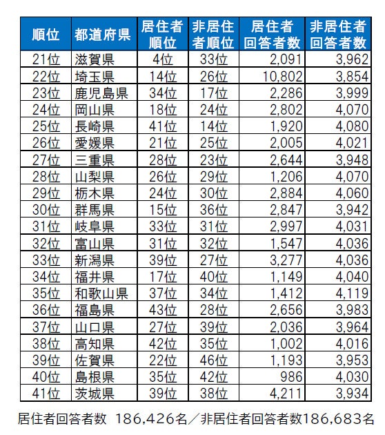 他社のランキングで話題になった茨城県は総合41位、居住者評価39位、非居住者評価38位、群馬県は総合30位、居住者評価15位、非居住者評価36位、栃木県は総合29位、居住者評価24位、非居住者評価30位と上位ではありませんが、最下位近くではありません。茨城県については、首都圏の一都三県居住者からの評価は高くなっていますが、関西圏(2府4県)および愛知県居住者からの評価が非常に低くなっているため全国平均順位が上がらないという特徴があります。