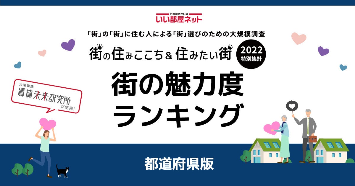 大東建託株式会社(本社:東京都港区、代表取締役社長:小林克満)は、過去最大級の居住満足度調査を行い、「いい部屋ネット 街の魅力度ランキング2022<都道府県版>」として集計しました。なお、本ランキングが定義する魅力度とは、実際に住んでいる人々が、住んでいる街についてどれくらい満足しているか、また、住んでいない人々に地域の魅力がどの程度伝わっているかを指しています。