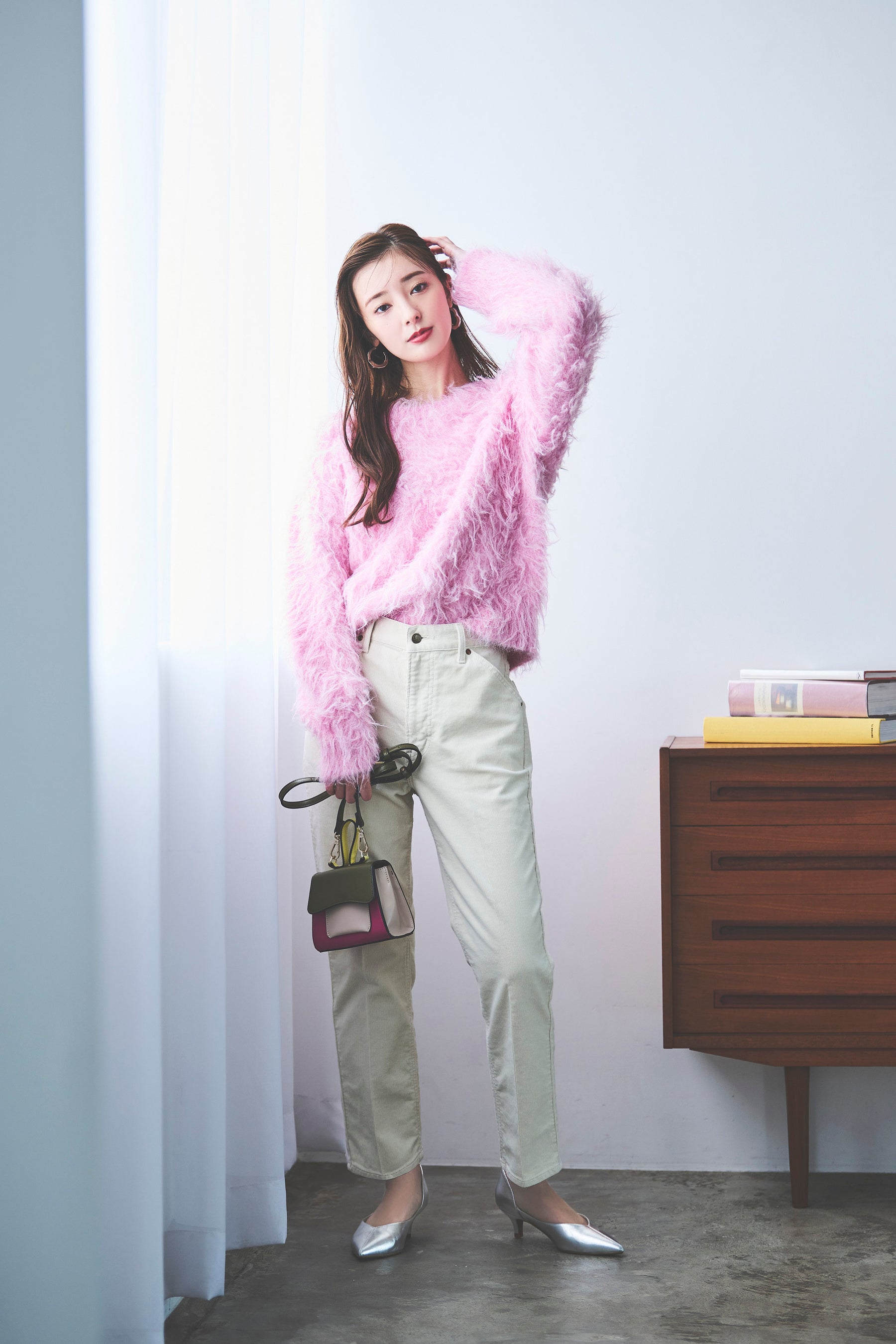 華やぎのあるピンクが目にとまる、動きのある毛足の長い素材を使用したプルオーバーニット。素材とカラーの存在感を存分に楽しめるシンプルなコーディネートに仕上げています。Lee別注コーデュロイパンツのテーパードシルエットがきれいめな印象に。シルバーのパンプスや配色がアクセントのミニバッグでトレンド感を。