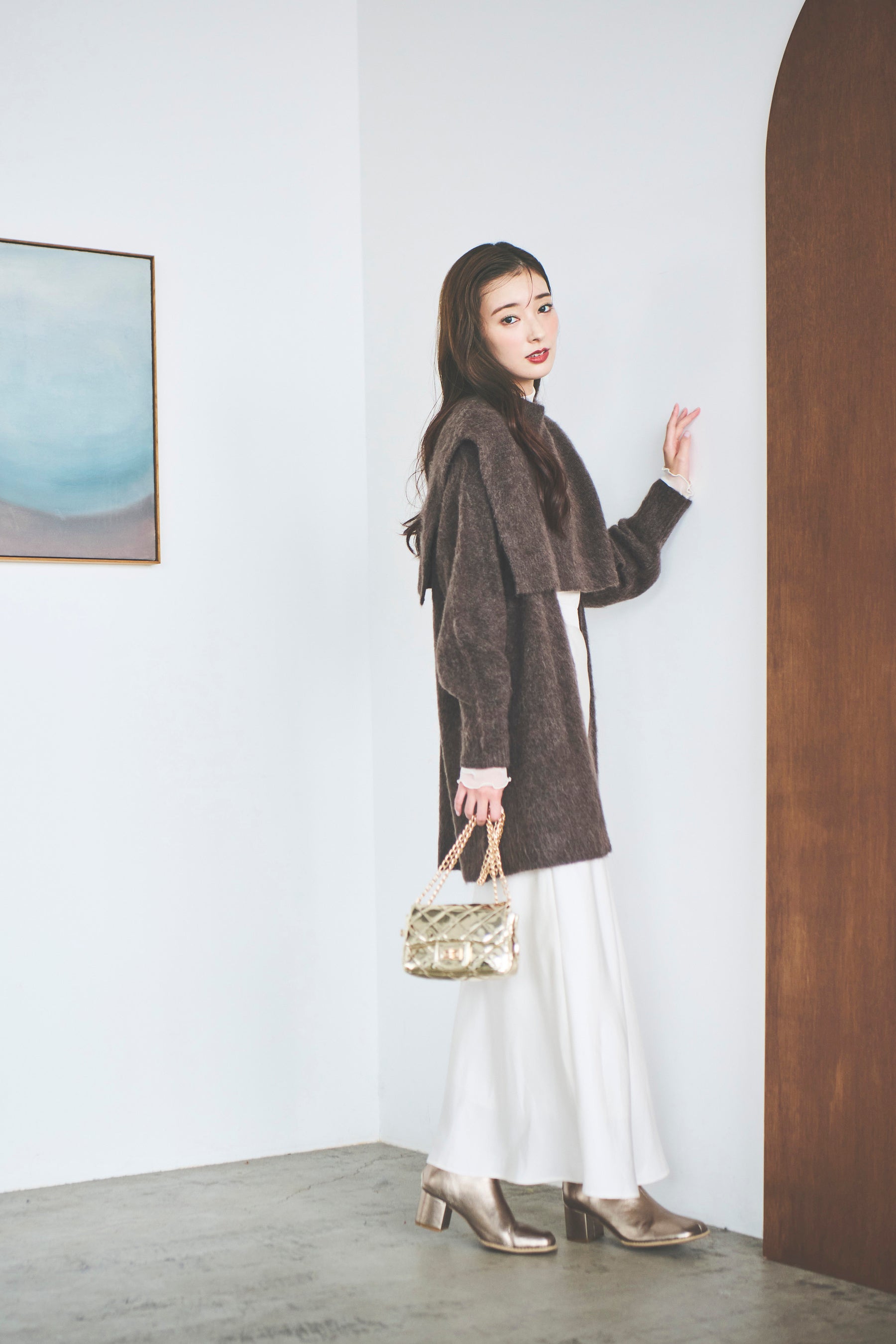 スヌードとショールカーディガンの新鮮なレイヤードスタイルが楽しめるニット。長さのあるショールカーディガンは縦長のIラインを作れるようにインナーとスカートを同色でまとめたのがポイントです。ふんわりとした素材のニットに光沢のあるサテンスカートの相性が冬ならではの組み合わせに。ブラウンのニットのウォーム感をゴールドの小物が盛り上げてくれます。