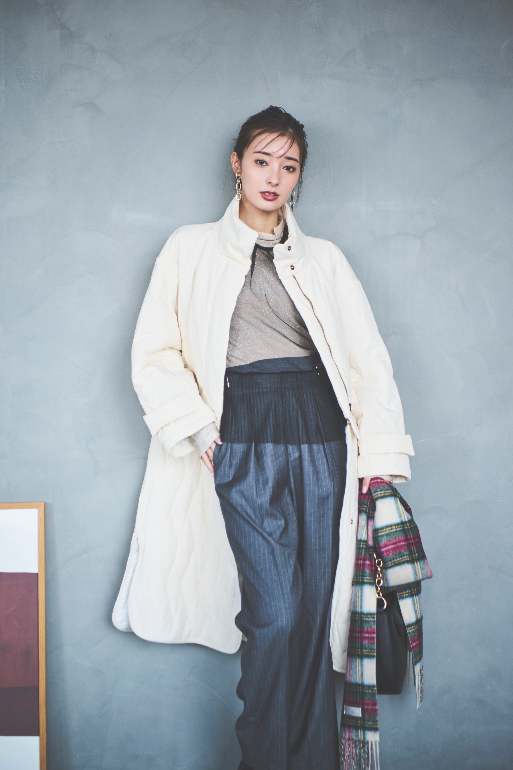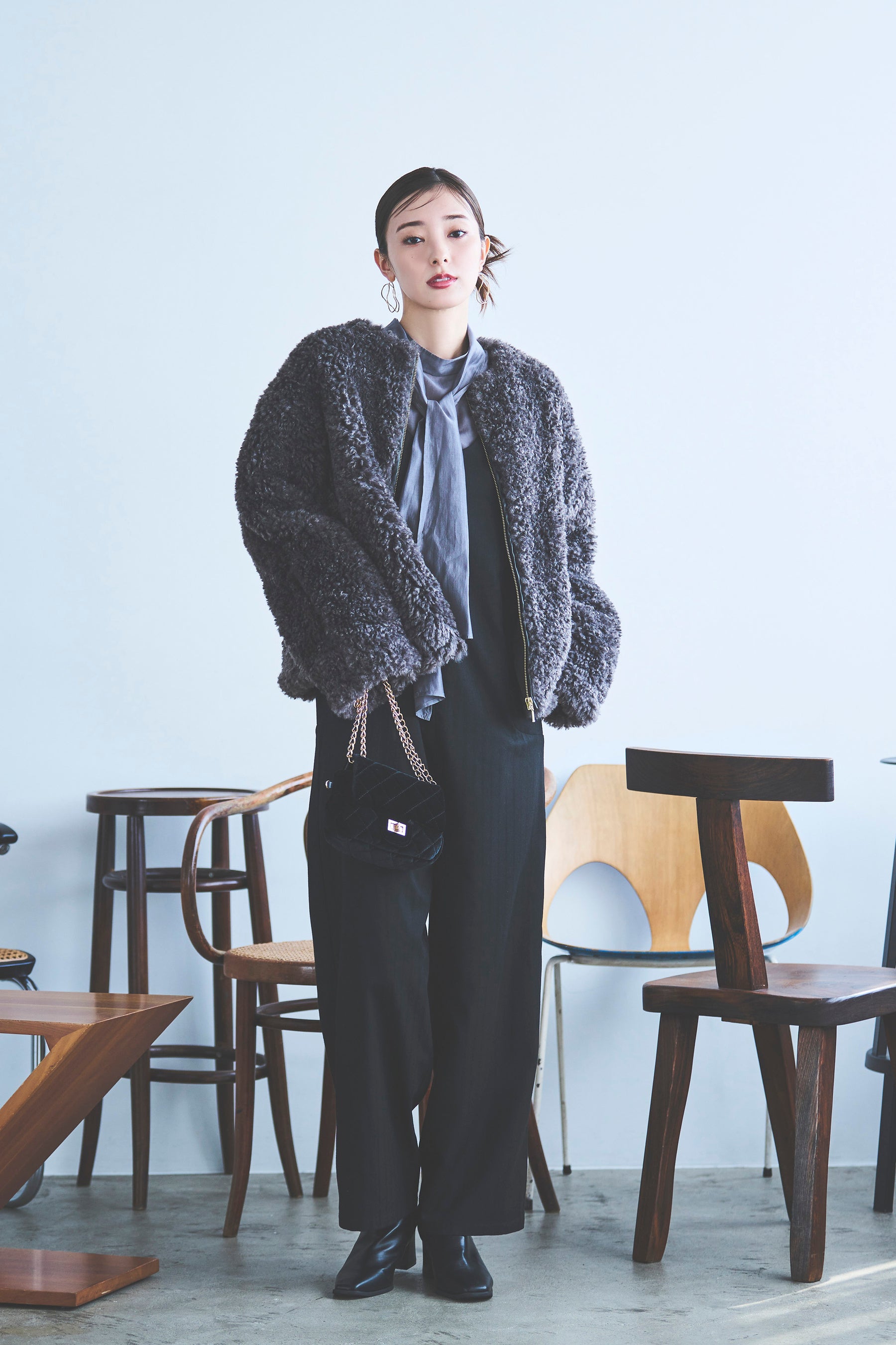 ボリューム感あるシープファー調のショートコートをクールにスタイリング。オールインワンはグレーとブラックだけのシックな組み合わせで大人っぽいモードな印象に。コートは2WAYで楽しめる取り外し可能な衿つき。ちょっぴりフェミニンに決めたい時はつけて着るのもおすすめです。