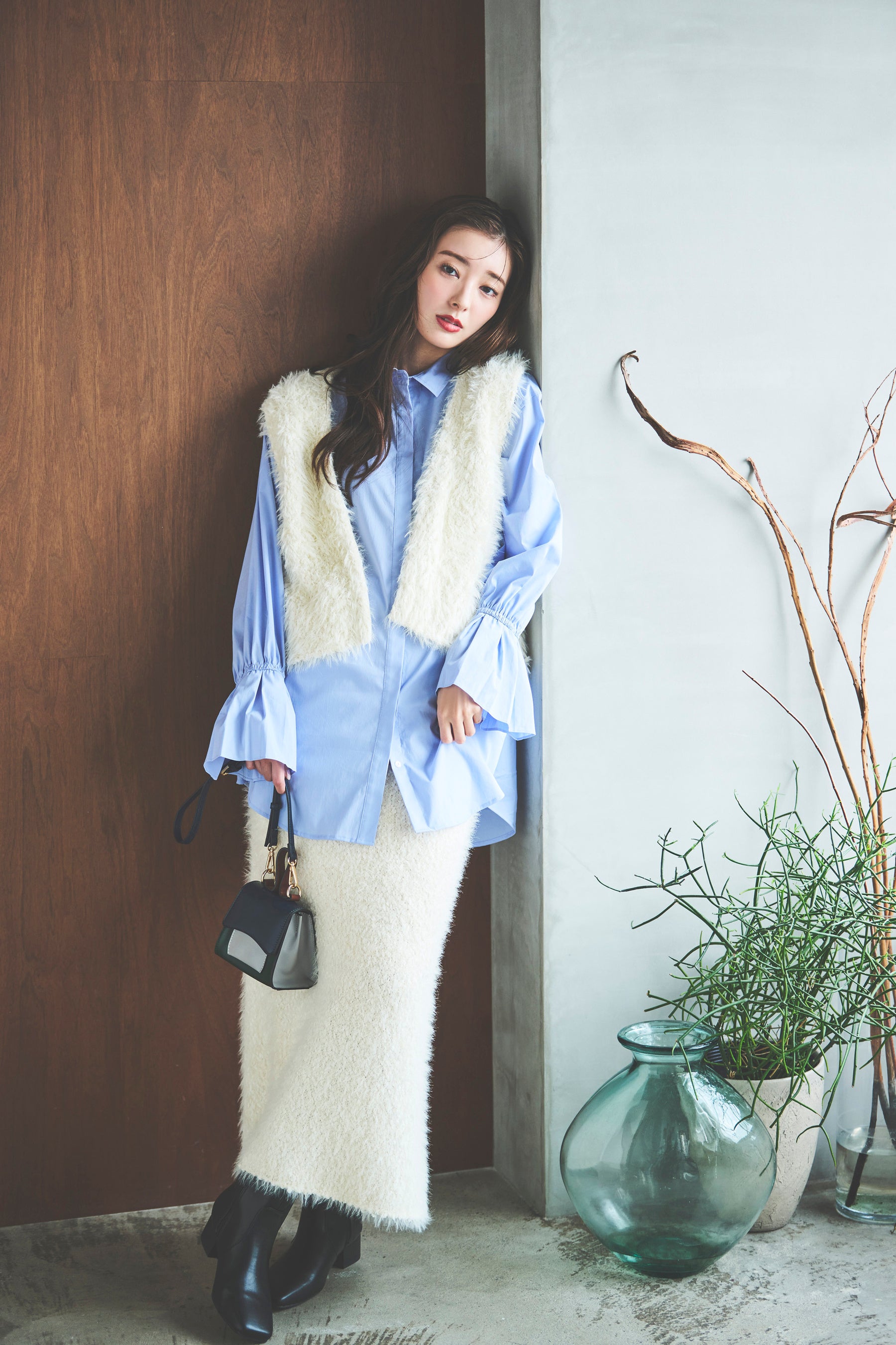 ジレ(¥7,590)/シャツ(¥7,590)/スカート(¥8,690)/バッグ(¥8,690)/ブーツ(¥17,490)