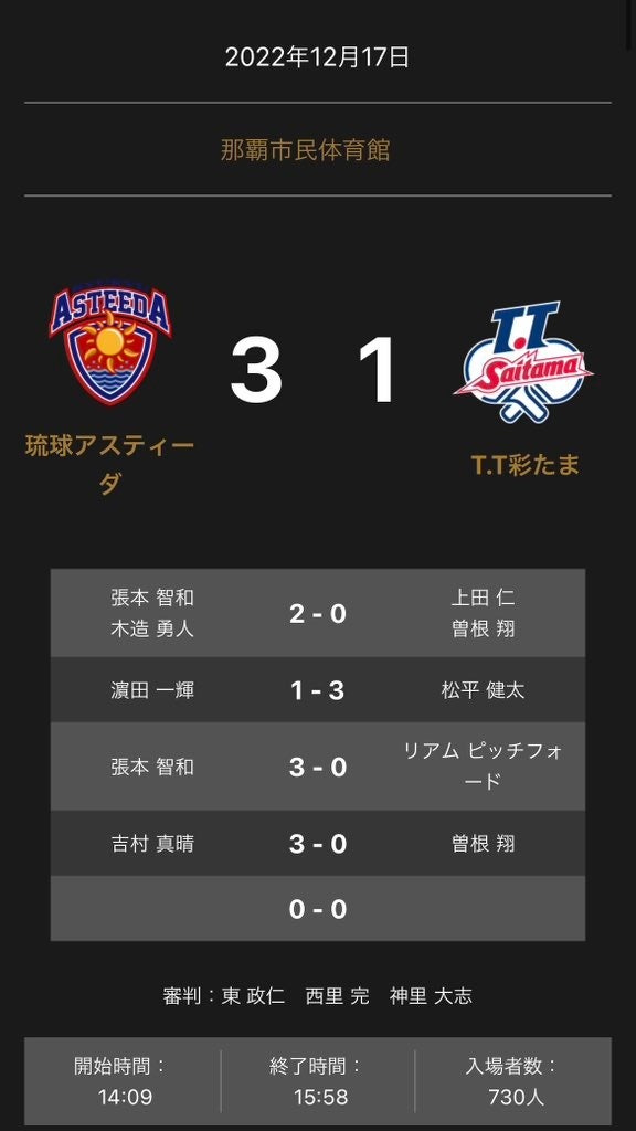 ノジマTリーグ 2022-2023シーズン 公式戦 12月17日開催 琉球アスティーダ vs T.T彩たま 試合結果