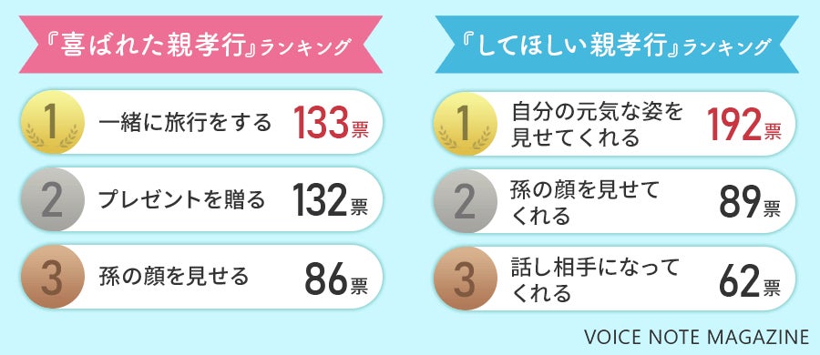ボイスノートマガジン(運営会社:株式会社NEXER)は、喜ばれた親孝行に関するアンケートを実施し、結果をサイト内にて公開したので紹介します。
