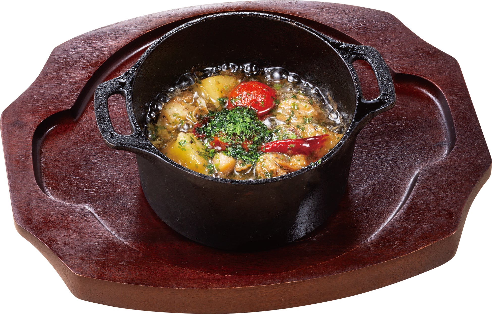 ニンニクとアンチョビをベースにしたオイルに、ベビー帆立と赤貝のひも、糸かつお、あおさなどを入れて、杉玉らしいアヒージョに仕上げました。