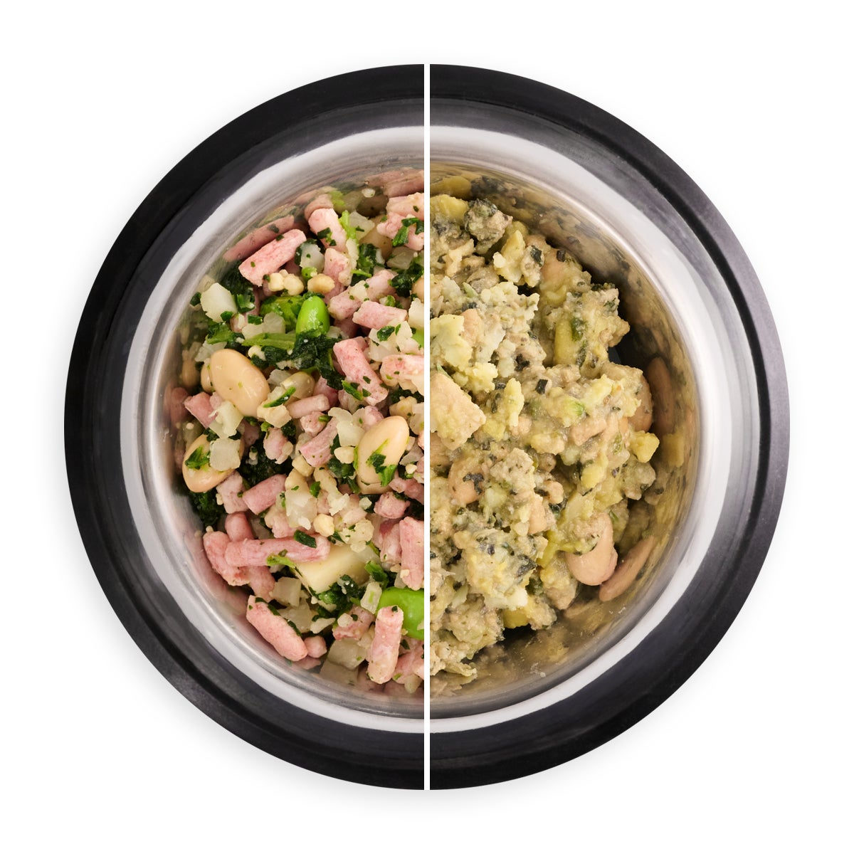 豚肉の良質なたんぱく質と、大根・春菊の食物繊維やカリウムは筋肉維持と消化サポートに役立ちます。活動量の多い成犬やシニア犬の健康維持食としておすすめです。