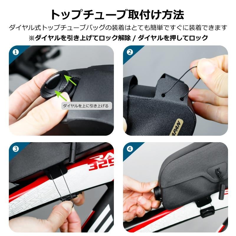 このトップチューブバッグは、革新的なダイヤルシステムを搭載し、