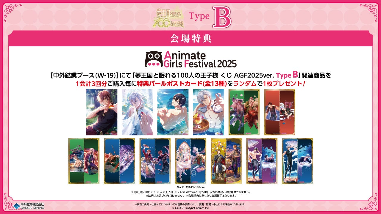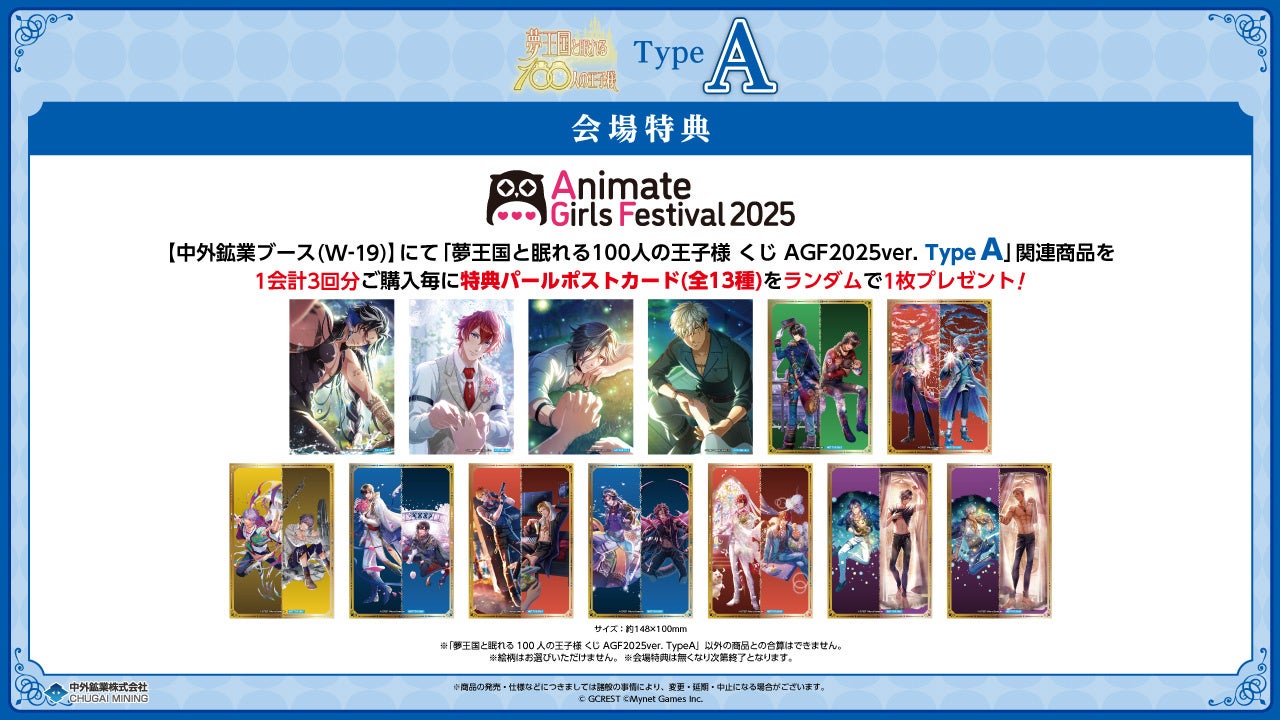 中外鉱業ブースにて「夢王国と眠れる100人の王子様 くじ AGF2025ver.」を1会計くじ3回分ご購入毎に、特典パールポストカード(全13種)をランダムで1枚プレゼントします。