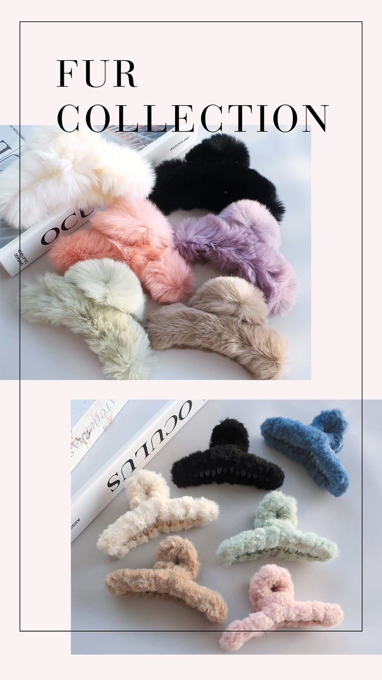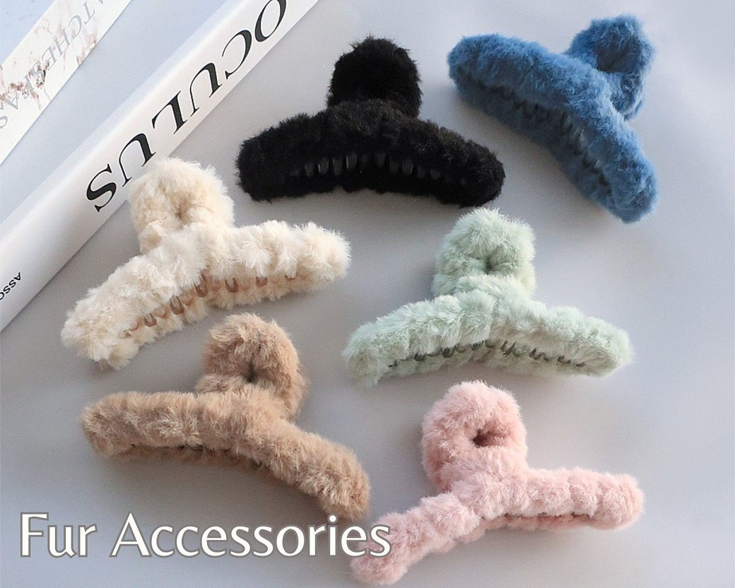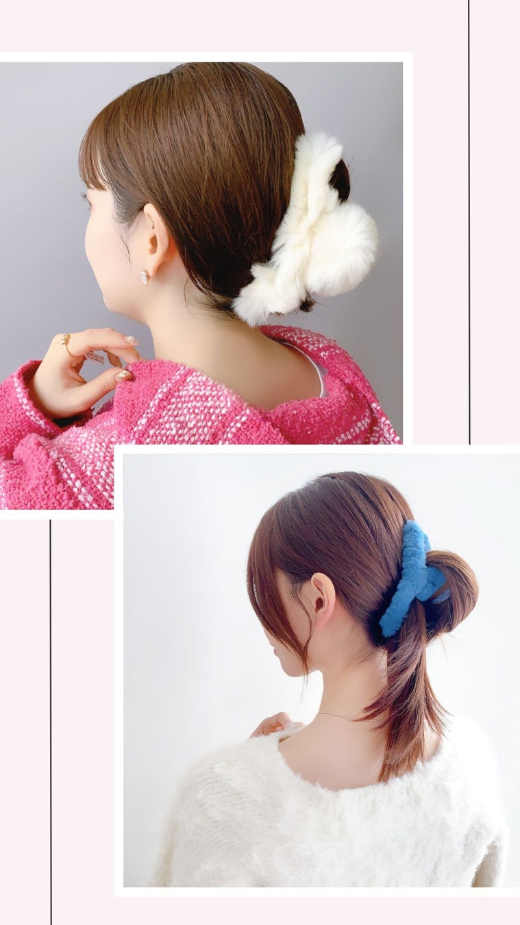 スウェットやニットとの相性抜群のフェイクファーのバンスクリップ。