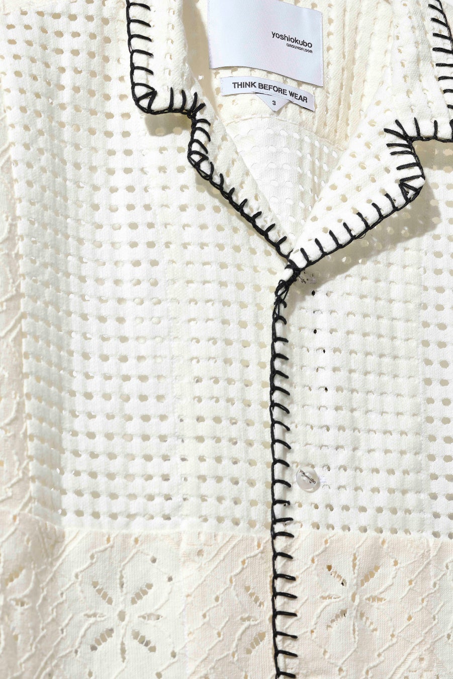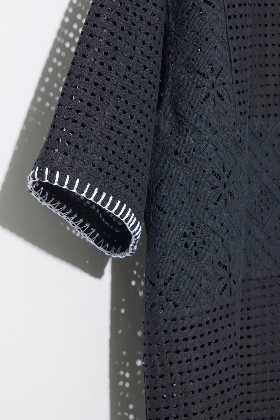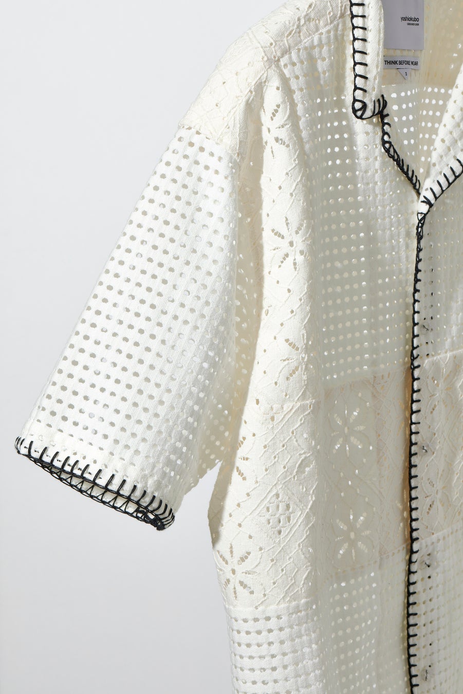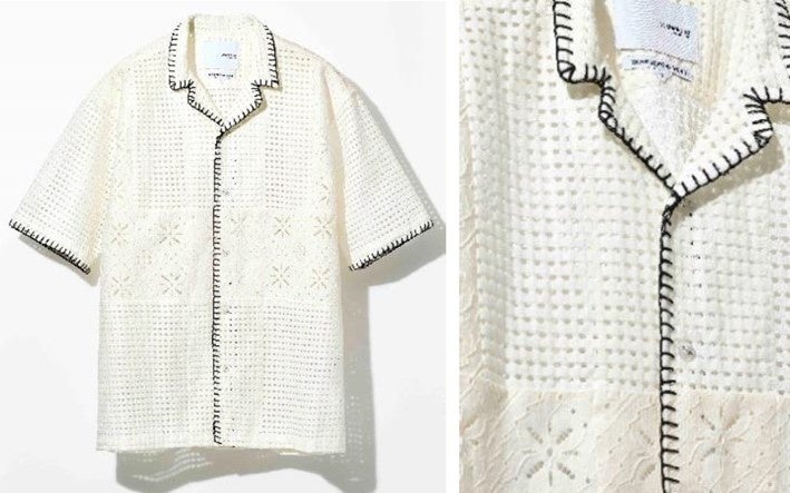 ドットとフラワーモチーフのホールレースを、バランスよく切り替えた開襟シャツは、ブランケット刺繍を施し、程よい存在感を与えたユニセックスで幅広い年代の方が使えるクセのないデザインが特徴。シアー感が涼しげな印象で、インナーとのコーディネートも楽しめます。