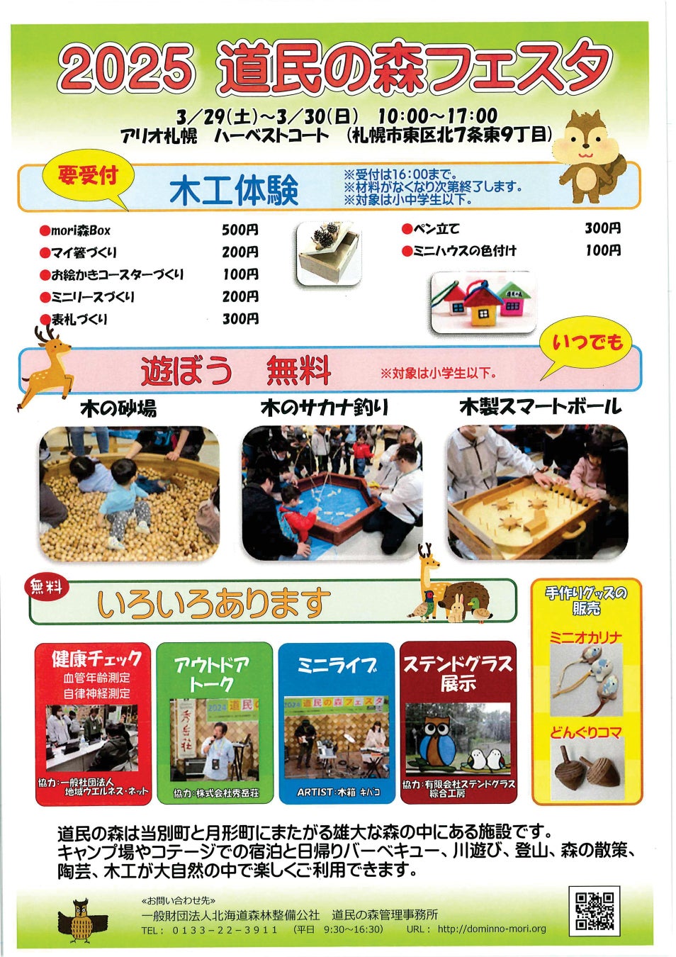 北海道立道民の森では、5月の開園に先立ち、令和7年3月29日(土)、30日(日)にアリオ札幌で「道民の森フェスタ」を開催します!