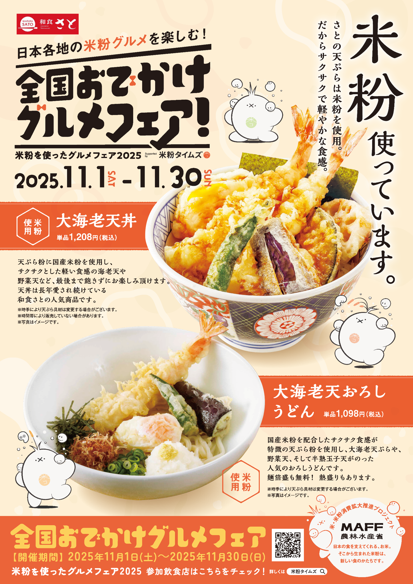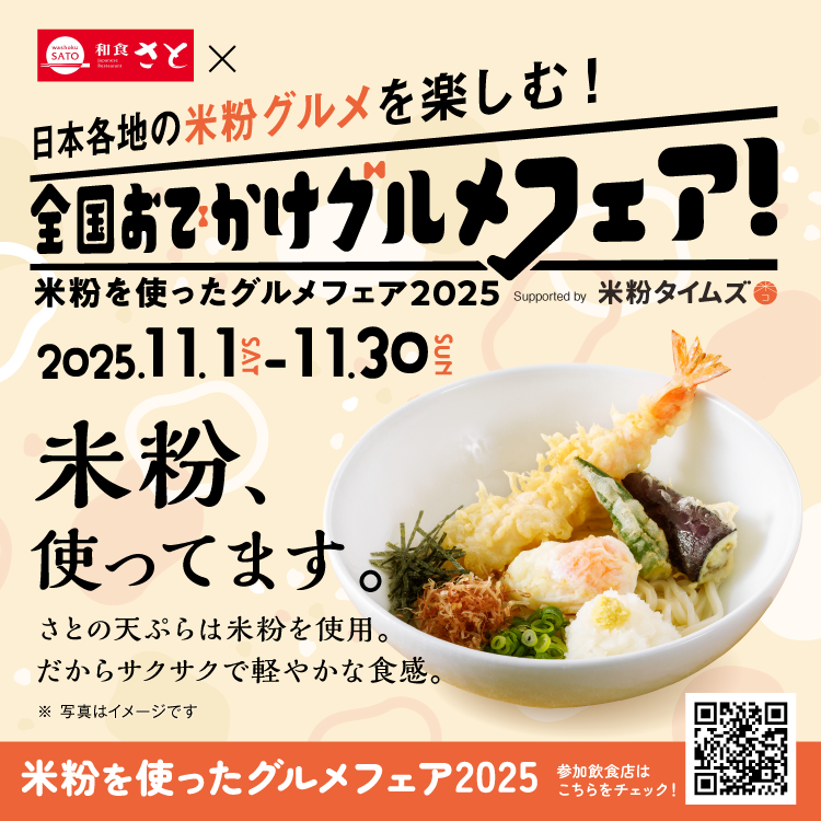 国内198店舗を展開する「和食さと」では、米・米粉消費拡大推進プロジェクトの一環として、2025年11月1日(土)~11月30日(日)の期間で開催する「日本各地の米粉グルメを楽しむ!全国おでかけグルメフェア!」のイベントに参加いたします。
