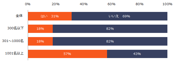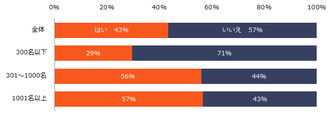 2025年卒採用を実施予定の企業にサマーインターンの実施有無を聞くと、43%が「はい」(実施する)と回答しました。企業規模別で見ると、301名以上の企業は半数以上(301名~1000名:56%、1001名以上:57%)が実施すると回答したのに対し、300名以下の企業の実施は29%に留まり、7割が実施していないことが分かりました。