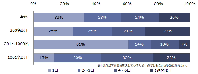 サマーインターンの開催日数を伺うと、最多は「1日」(33%)でした。企業規模別で見ると、1001名以上の企業の86%が「2日以上」(2~3日:30%、4日~6日:33%、1週間以上:23%)と回答しました。