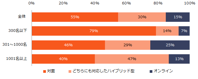 実施内容を伺うと、最多は「業務体験をメインにしたもの」(64%)でした。続けて実施方法を伺うと、55%が「対面」と回答し、インターンにおいても対面回帰の傾向がうかがえました。企業規模別で見ると、300名以下の企業は79%が「対面」と回答し、従業員数が少ない企業ほど対面を重視していることが分かりました。