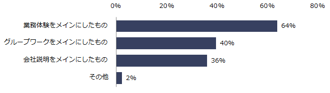 2:開催日数は「1日」、実施内容は「業務体験をメインにしたもの」が最多。従業員規模が小さい企業ほど、対面開催を重視する傾向に。(図2~4)
