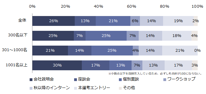 「サマーインターン実施直後に行なう施策は、どのような活動を計画していますか?」と伺うと、「会社説明会」が26%で最多でした。企業規模別で見ると、1001名以上の企業は「会社説明会」が30%でトップだったのに対し、300名以下の企業は「会社説明会」「個別面談」(それぞれ25%)、301~1000名の企業は「個別面談」(25%)が最多でした。