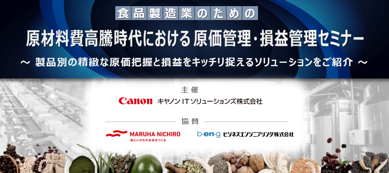キヤノンマーケティングジャパングループのキヤノンITソリューションズ株式会社(本社:東京都港区、代表取締役社長:金澤 明、以下キヤノンITS)は、食品製造業向けに「原価管理・損益管理」の無料オンラインセミナーを2022年10月25日(火)に開催します。