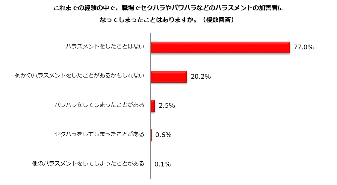 「2020年から大企業にパワハラ防止措置が義務化され、2022年4月からは対象が中小企業に拡大されることについてご存知でしたか」という質問に対しては、知っていた人が3割を切りました。法制度の周知は進んでいないようです。続けて、「法律による防止措置の義務化で、パワハラは減少すると思いますか」との質問には「思う」39.2%に対して「思わない」が53.5%と上回りました。また、パワハラ被害経験者に絞ると「思わない」が6割を超えます。実際に被害を経験すると、法律だけでは防げないという思いがより強くなるようです。一方で約1/3は「思う」と回答していて、法律によるパワハラ防止措置義務化に期待する思いを持つ人も一定程度存在します。フリーコメントには、実際にパワハラを経験した人からの悲痛な声も寄せられました。パワハラを含め、職場内での様々なハラスメントが有する問題の根深さは、加害者が無自覚であるケースが多いことにあるように思います。無自覚だと、パワハラを法律で規制したとしても効果は限られてしまいます。誰もが加害者になる可能性があると認識した上で、指導・指示が押しつけになっていないか、意図は十分伝わっているかなど、相手の立場に立ったコミュニケーションに各自が注意を払うこと、また職場においては、研修などを通じて啓発することがパワハラ防止には欠かせないのだと考えます。