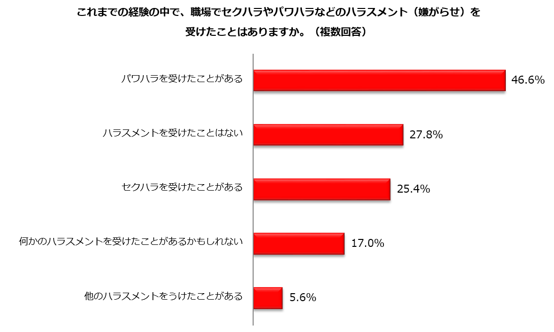1.「パワハラ受けたことある」46.6%、「セクハラ受けたことある」25.4%