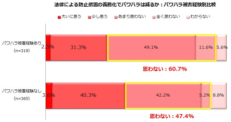 5.法律による防止措置の義務化でパワハラは減るか:パワハラ被害経験別比較