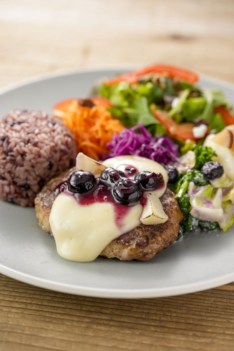 ジューシーなハンバーグに、シュレッドチーズとパルメザンチーズの濃厚なソースと国産ブルーベリーを使ったベリーソースの2種のソース、たけのこなど食感に特徴がある野菜を組みあわせたメニュー。