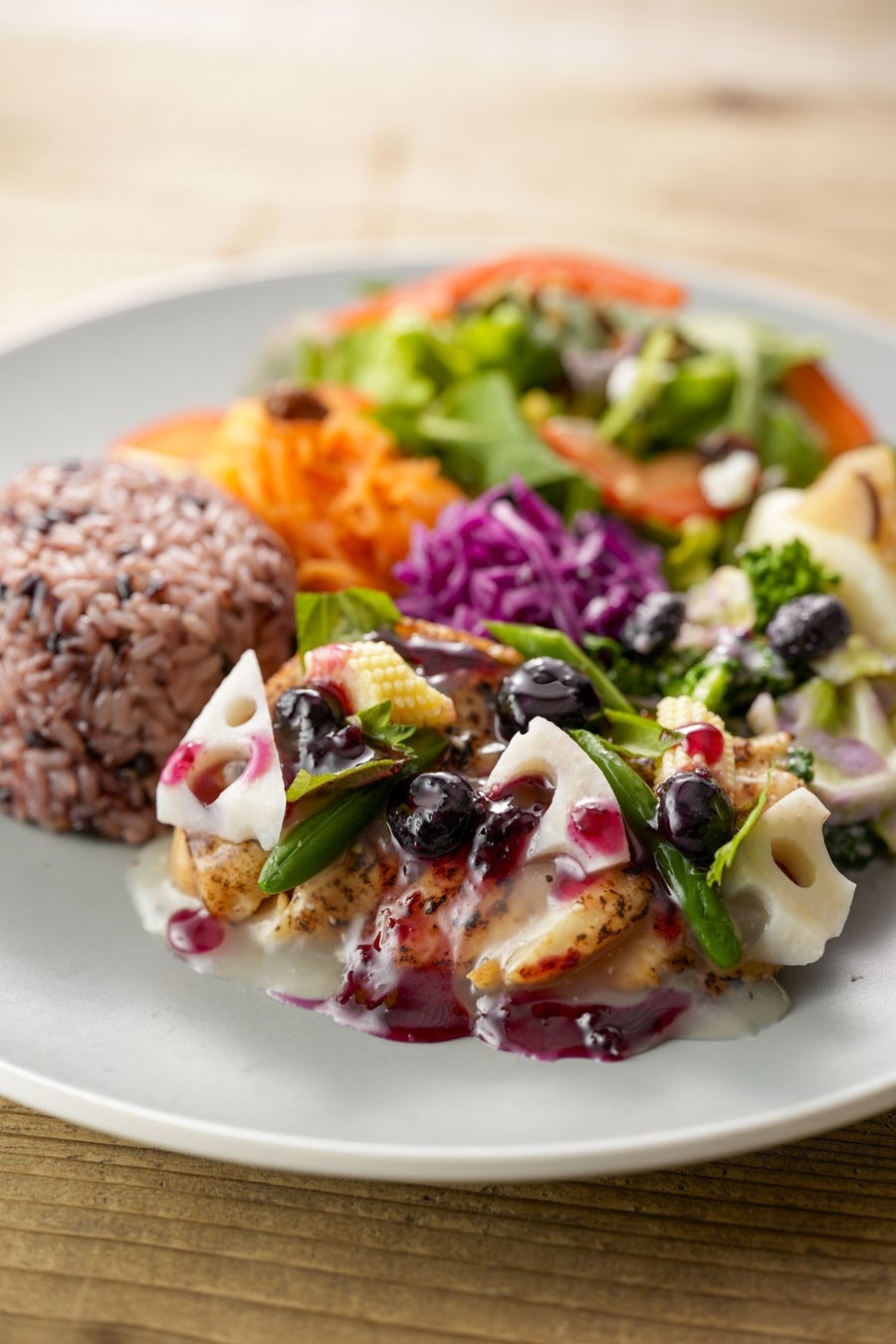 塩糀で漬け込んだ鶏もも肉をオーブンで柔らかく焼き上げ、あっさりとした塩ベースのたれに、国産ブルーベリーのさっぱりとした酸味と青しその香りを合わせ、春~初夏にぴったりな爽やかなソースをかけています。