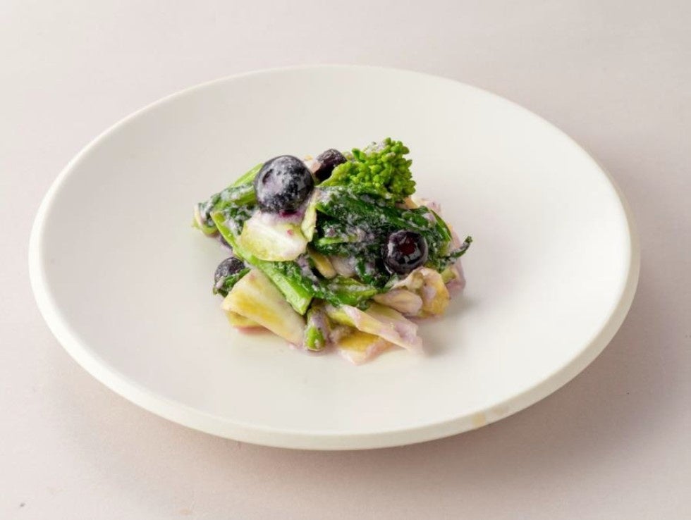 シャキシャキの春キャベツとほろ苦さが特徴の菜の花を使用した春野菜を使ったデリです。国産ブルーベリーの甘酸っぱさと春キャベツのみずみずしさ、菜の花のほろ苦さとの相性がよく、季節を感じられるメニューです。