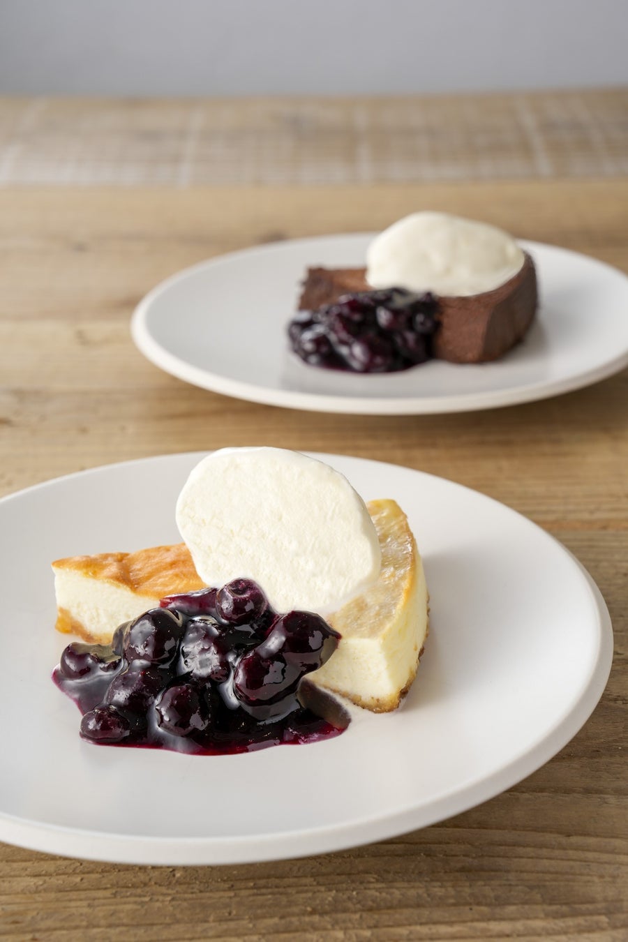 カロリーと糖質は控えめながら、濃厚な甘さとしっとりした食感が特徴で、定番人気のタニタカフェオリジナルケーキ2種類に、わかさ生活の国産ブルーベリーを使用した酸味のあるソースを添えました。リッチなショコラとチーズにフレッシュな味わいをプラスし、バランスの取れたおいしさを楽しめるようにしました。