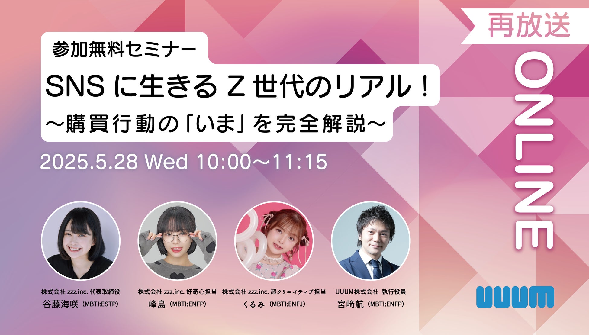 UUUM株式会社(本社:東京都港区、代表取締役 社長執行役員:梅景 匡之、以下UUUM)は、2025年5月28日(水)、Z世代のリアルな購買行動と消費感覚を紐解いたウェビナー「SNSに生きるZ世代のリアル! 購買行動の『いま』を完全解説」特別版の再配信を実施いたします。