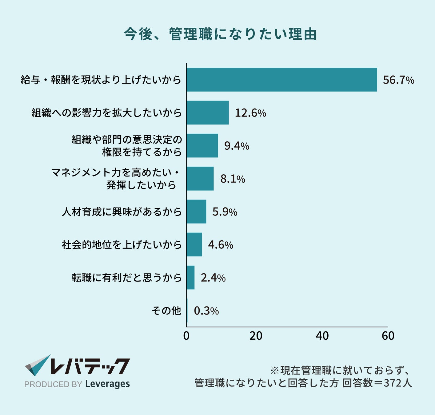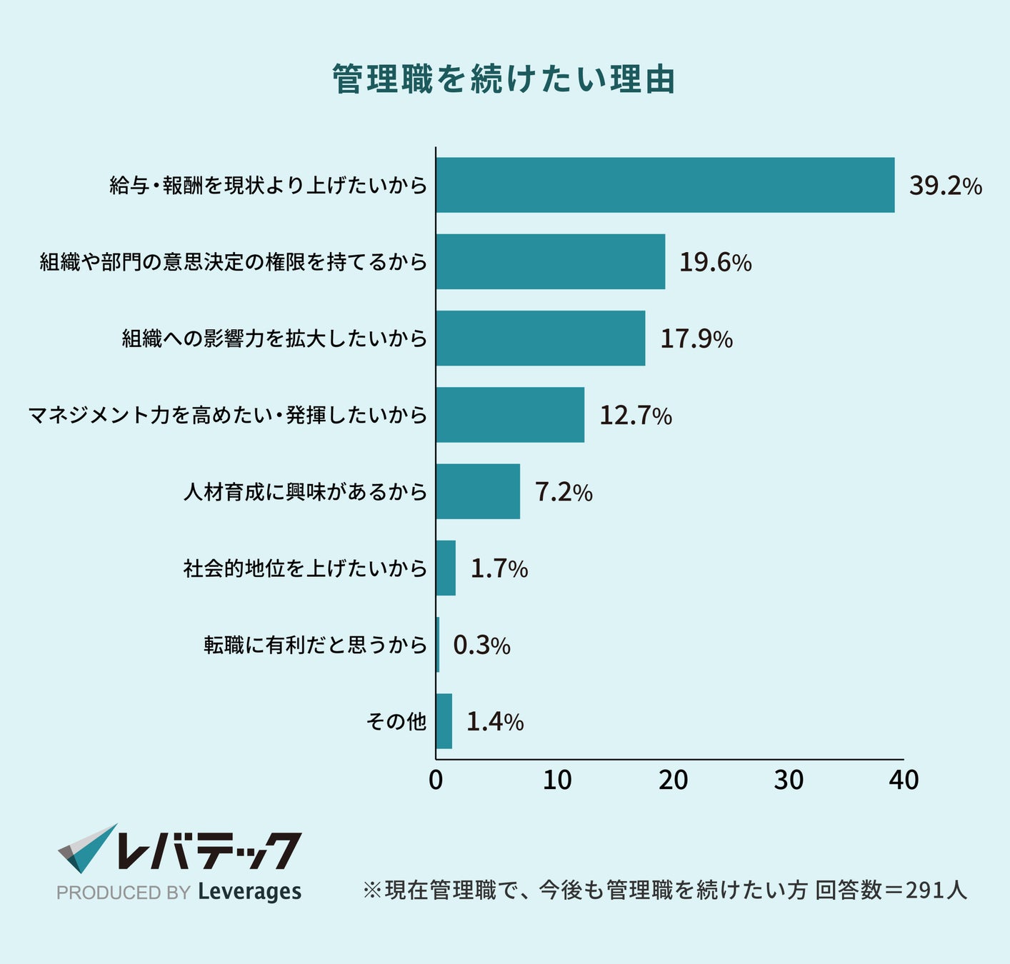 一方で管理職を続けたい理由としては、「給与や報酬を現状より上げたい(39.2%)」が最も多く挙げられました。次いで、「組織や部門の意思決定の権限を持てるから(17.8%)」「組織への影響力を拡大したいから(14.9%)」も上位にくることから、給与面だけでなく、組織への影響力の大きさも管理職のやりがいに繋がっていると考えられます。
