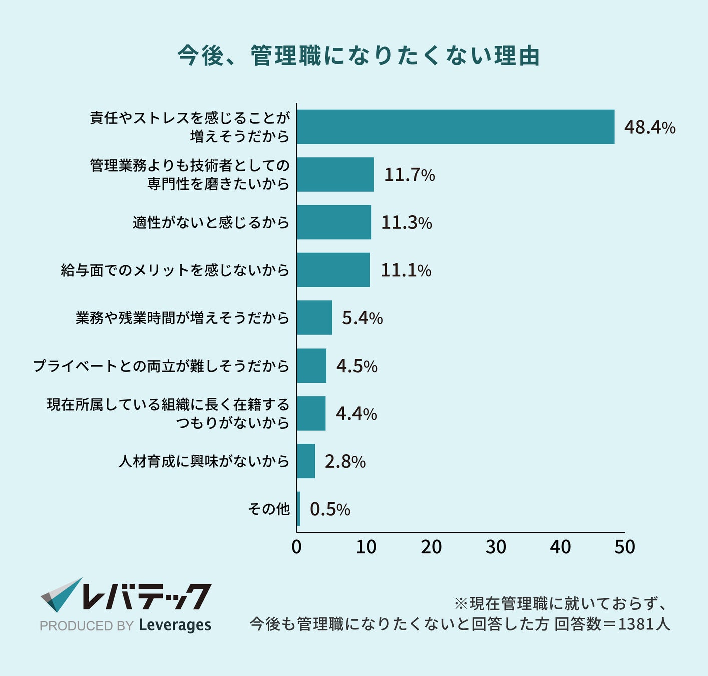 一方、約4人に1人は「管理職になりたくない」と回答しました。その理由として最も多かったのは、「責任やストレスを感じることが増えそうだから(48.4%) 」で、管理業務に伴う負担を懸念する人が多いことが明らかになっています。そのほか、「管理業務よりも技術者としての専門性を磨きたいから(11.7%)」「適性がないと感じるから(11.3%)」といった理由も挙がり、自身の志向性や適性に合った業務を重視する傾向も伺えます。