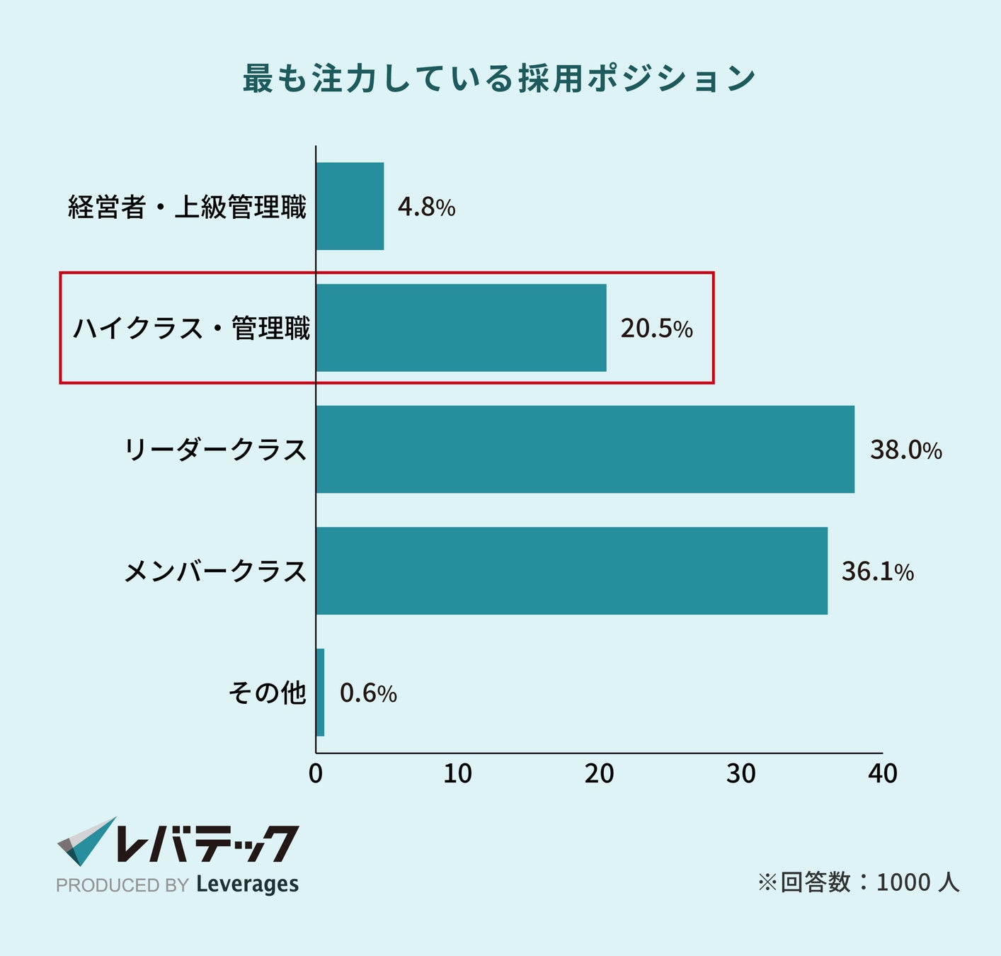 IT人材の採用において、企業が今年度最も力を入れて採用しているポジションは「リーダークラス(38.0%)」となり、「メンバークラス(36.1%)」「ハイクラス・管理職(20.5%)」が続く結果となりました。