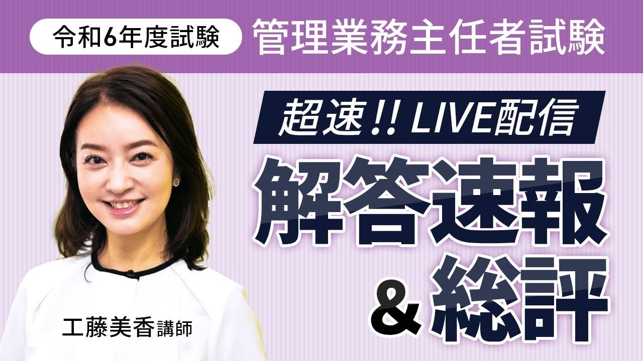 株式会社アガルート(本社:東京都新宿区、代表取締役:岩崎 北斗)が運営する「アガルートアカデミー」は、管理業務主任者試験当日の12月1日(日)に「解答速報」「総評」「合格ライン・合格点予想」YouTubeLIVE配信を無料で実施いたします。