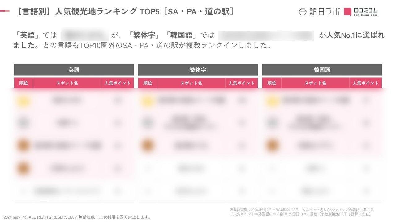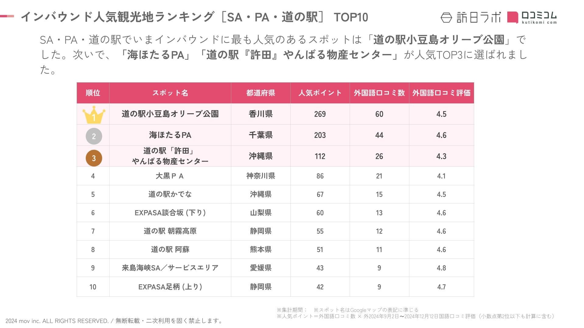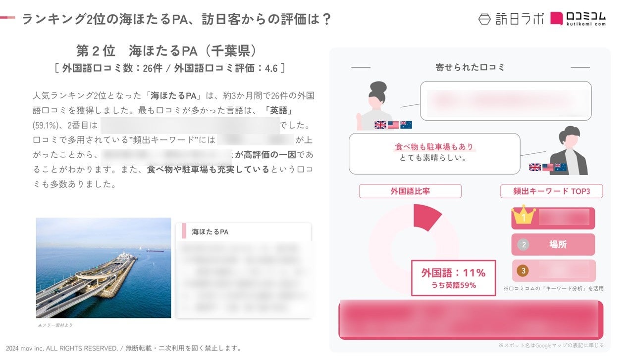 業界最大級のインバウンドビジネスメディア「訪日ラボ」及び 店舗向け集客一元化プラットフォーム「口コミコム」を運営する株式会社mov(代表取締役:渡邊 誠、本社:東京都渋谷区、以下mov)は、SA・PA・道の駅に寄せられた最新の口コミデータから、独自の『インバウンド人気観光地ランキング』を発表しました。