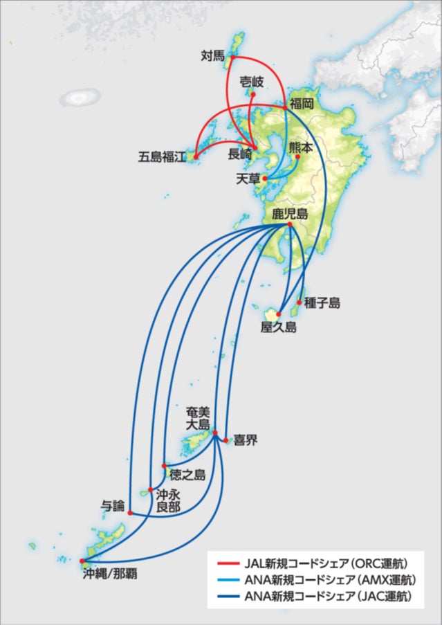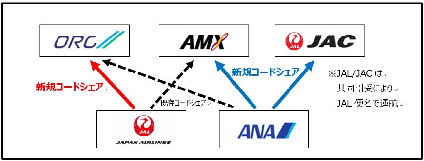 この大手系列を超えたコードシェア(共同運航)では、AMX・JAC運航便の座席をANAが販売し、またORC運航便の座席をJALが販売することが可能となります。AMX・ORC・JACは、既存のコードシェアなどの提携に加え、新たな販路が広がることで新規需要を創出し、旅客数増につなげ、安定した路線運営を推進していきます。また、ANA・JALは、地域航空3社の協業促進を引き続き支援し、共に都市と新たに加わる就航地域との人流の創出に取り組むことで、地域活性化に努めてまいります。
