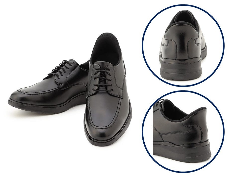 また、多くのメンズシューズで一般的な2Eよりも幅広の4E設計を採用したことに加え、「フラットソール」と「クッション性の高い低反発中敷き」で足への負担軽減を実現。これまでのビジネスシューズにはなかった「履きやすさ」と「歩行の軽快さ」を両立し、働く人々を支える一足に仕上げました。